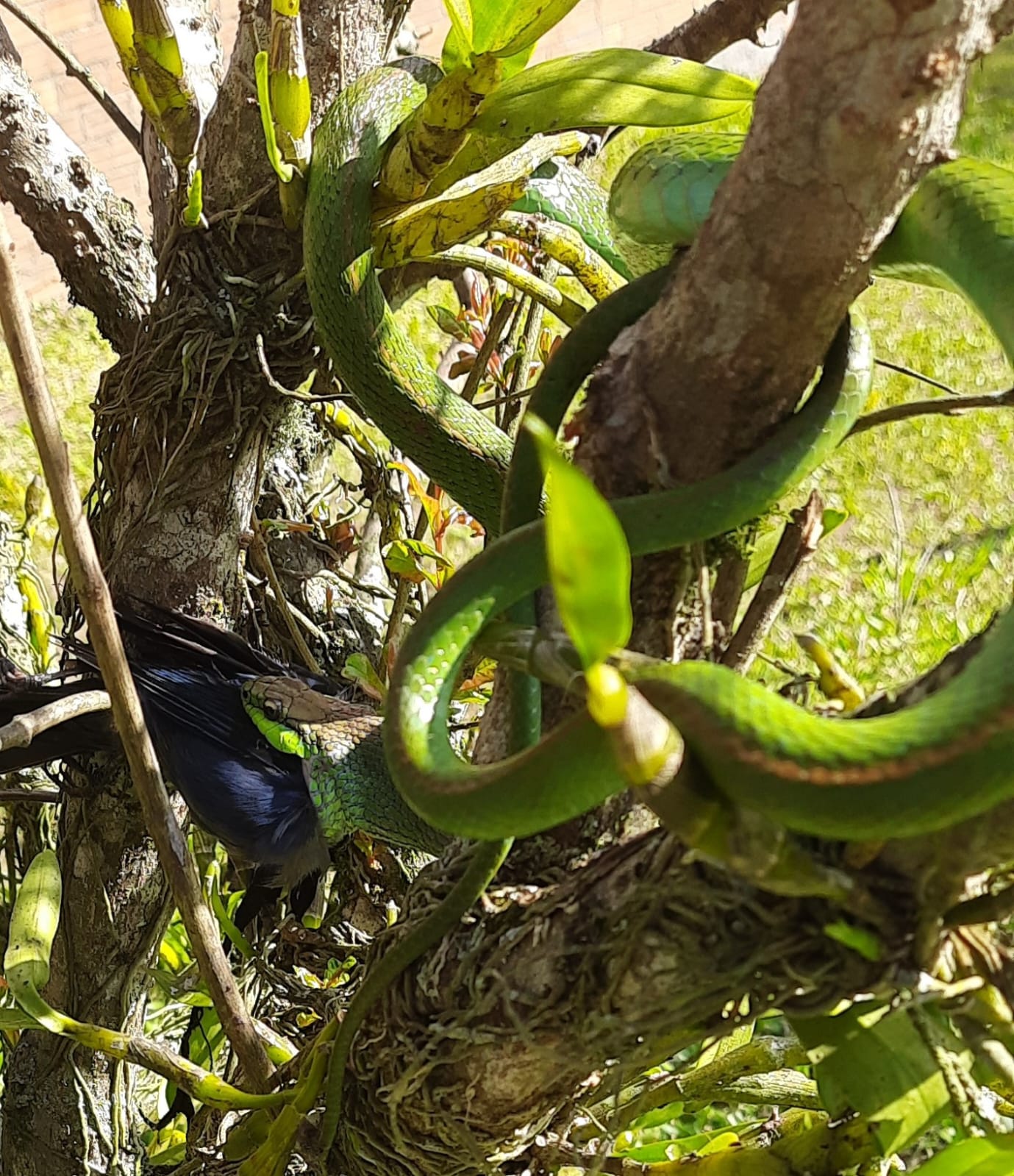 Ato I 16 de setembro, 15 horas. Um forte debater de asas me desvia da observação dos camboins, onde procurava cochonilhas. Ergo o olhar, e aí está a cobra cipó com sua presa recém capturada. Muito vi a cobrinha, em sua paciente espera sobre a romãzeira, imóvel ou acompanhando o balanço da brisa. Também vi…