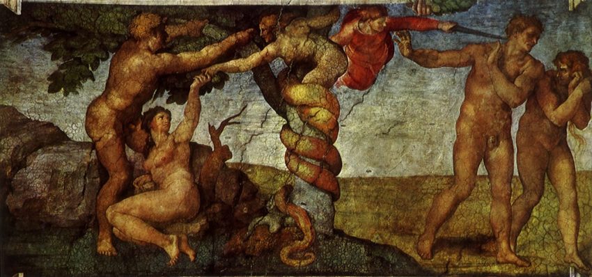 A ilustração é de Michelangelo, Adão e Eva, e está na Capela Sistina.
